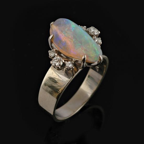 Centrally set with a freeform solid crystal opal flanked by three round brilliant cut diamonds to each shoulder, all in 18ct gold and platinum.