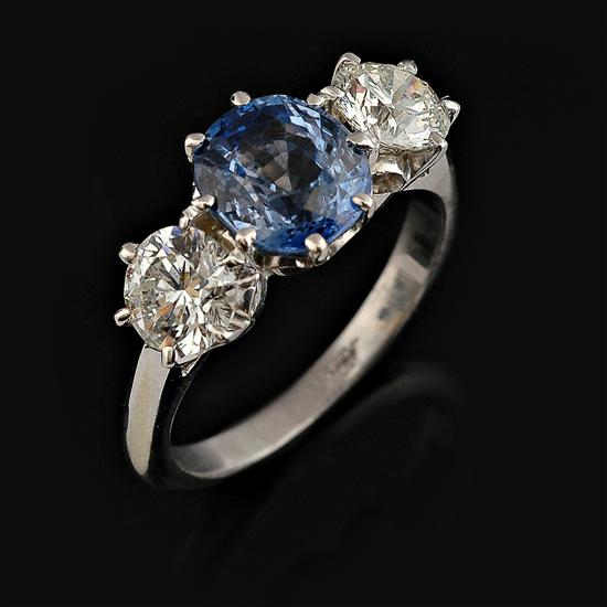 Centrally set with an oval sapphire weighing 2.74cts flanked by a round brilliant cut diamond to each side totalling 1.43cts, all in 18ct white gold, independent valuation available.