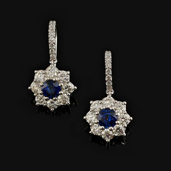 Each articulated drop set with a central sapphire weighing 0.815cts totalling 1.63cts surrounded by round brilliant cut diamonds totalling 1.62cts, all in 18ct white gold to diamond set shepherd hook fittings, independent valuation available.