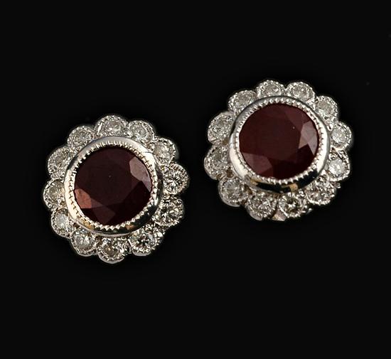 Each set with a central ruby weighing 1.675cts totalling 3.35cts surrounded by round brilliant cut diamonds totalling 0.55cts, all in 18ct white gold to post and butterfly fittings, independent valuation available.