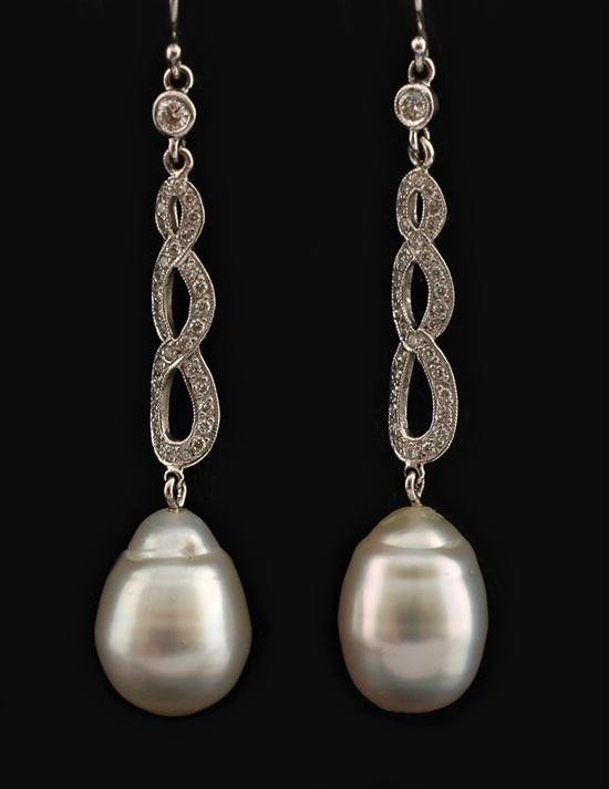 Each articulated drop set with a baroque pearl of creamy white hues measuring 11.3mm with elongated diamond mounts in an open twist setting, all in 18ct white gold, to shepherd hook fittings.