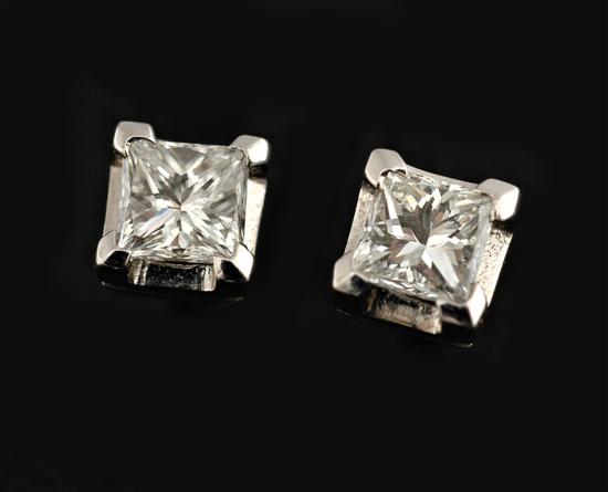 Each set with a princess cut diamond weighing 0.30cts totalling 0.61cts, all in 18ct white gold, to post and butterfly fittings.