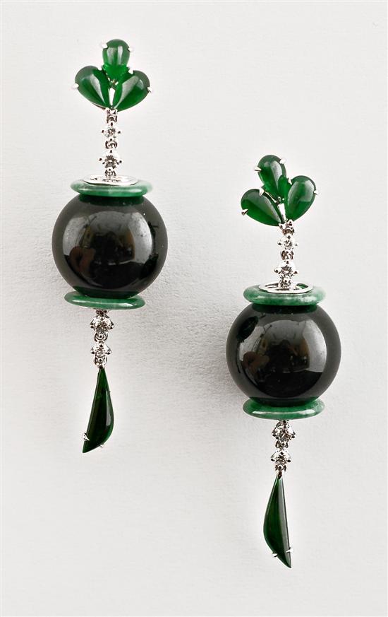 Each earring comprising a jadeite set stud above a jadeite ball and diamond set drop all in 18ct white gold to post and butterfly fittings.
