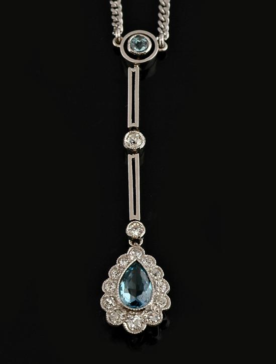 The pear cut aquamarine within a border of round brilliant cut diamonds suspended below articulated aquamarine and diamond set baton drops, all in 18ct white gold, to a 9ct white gold chain.