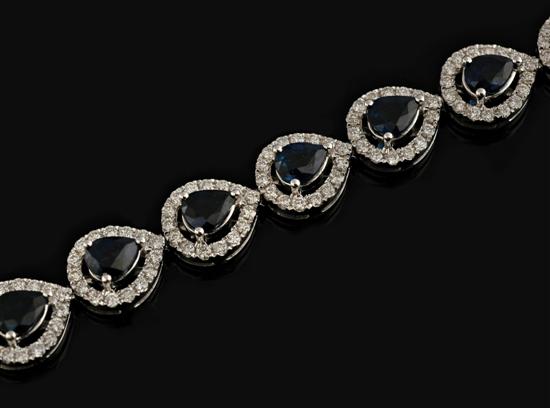 Set with nineteen pear cut sapphires totalling 8.30cts each within a border of round brilliant cut diamonds, in 18ct white gold, total length 180mm.