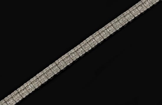 Comprising a row of baguette cut diamonds between a border of round brilliant cut diamonds all totalling 8.41cts in articulated links in 18ct white gold, total length 180mm. See illustration.