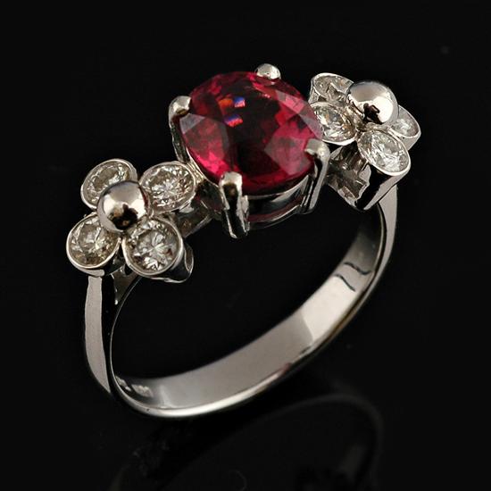 Centrally set with an oval red spinel weighing 2.27cts flanked by a floral cluster of four diamonds to each shoulder, all in 18ct white gold, independent valuation available.