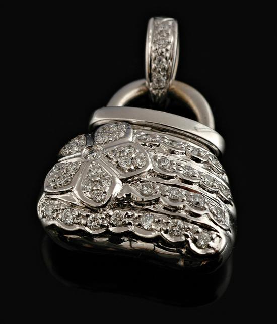 Modelled as an openable handbag with diamond detail totalling 0.50cts all in 18ct white gold.