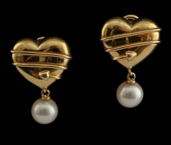 Of heart design with applied gold arrow decoration suspending a cultured pearl, all in 18ct gold, to post and clip fittings.