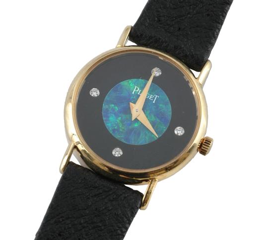 Quartz, circular opal dial with diamond numerals, 18ct gold case and bands with Piaget buckle, 20mm diameter.