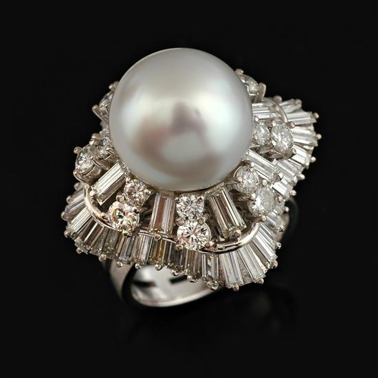 Centrally set with a near round pearl of silver white hues measuring 13.0mm to a fancy brilliant and baguette cut diamond cluster setting totaling 3.60cts, all in 18ct white gold. See illustration.
