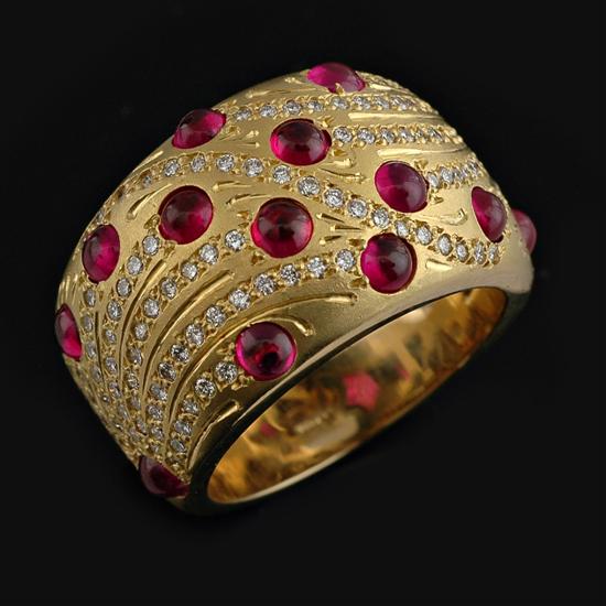 The wide band set with a spray of diamonds totalling 0.68cts and randomly set rubies cut en cabochon, all in 18ct gold.