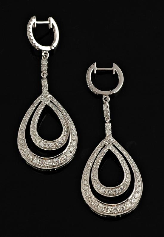 Of double teardrop design set with round brilliant cut diamonds totalling 2.41cts, all in 18ct white gold to post and clip fittings, independent valuation available.