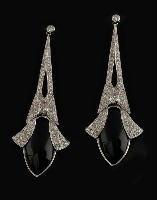 The elongated drops set with onyx and round brilliant cut diamonds totalling 1.51cts, all in 18ct white gold, independent valuation available. See illustration.