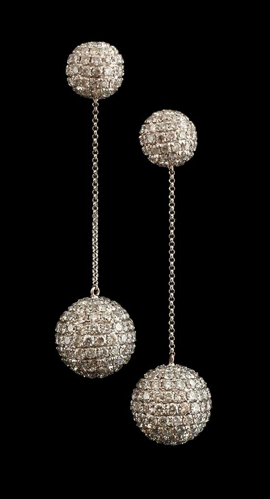 Each earring comprising a ball stud above a larger ball drop suspended on chain, both pave set with round brilliant cut diamonds totalling 9.84cts, all in 18ct white gold to post and butterfly fittings, independent valuation available. See illustration.