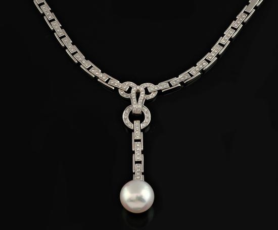 The elongated link necklace with round brilliant cut diamonds, suspending a detachable diamond pendant drop with enhancer fitting set with a near round pearl of silver white hues and pink undertones measuring 15.3mm, total diamond weight 1.80cts, all in 18ct white gold, total length 420mm. See illustration.