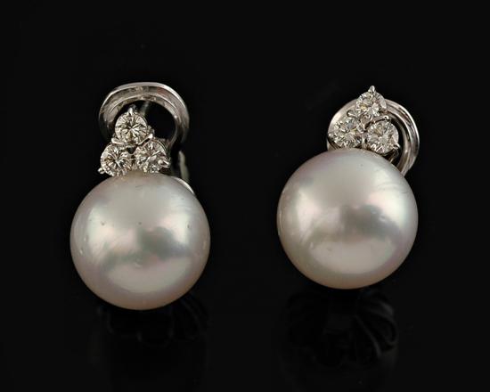 Each set with a pearl of silver white hues and pink undertones, measuring 13.2mm surmounted by three brilliant cut diamonds, all in 18ct white gold to post and clip fittings.