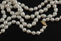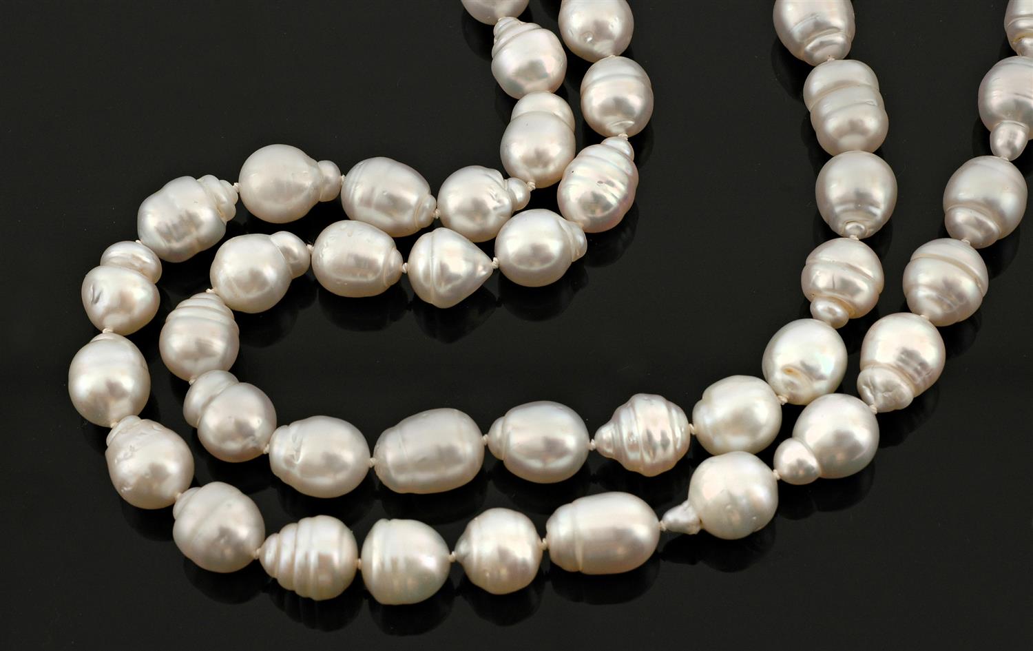 Comprising one hundred and four baroque pearls measuring 9.0mm to 11.5mm of silver white hues, to an 18ct gold clasp, total length 1350mm.