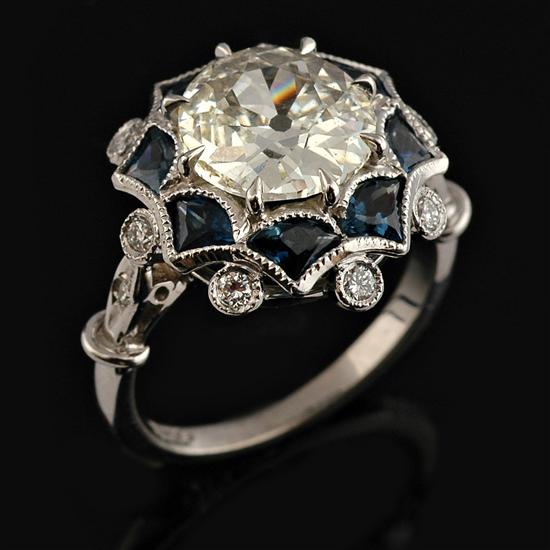 Centrally set with an old style vintage cut diamond weighing 2.58cts surrounded by sapphires totalling 1.50cts and further diamonds, all in 18ct white gold, independent valuation available. See illustration.