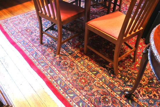 Having a blue border on a maroon ground, the whole with foliate decoration, 399 x 299 cm.