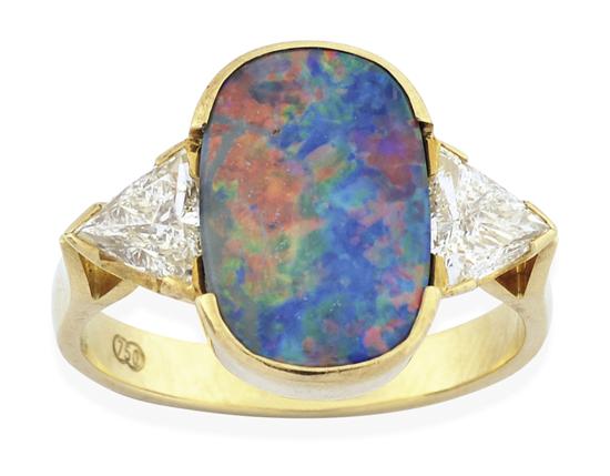 Centrally set with a boulder opal displaying fine play of colour, flanked by a trilliant cut diamond to each side, together totalling 0.63cts, in 18ct gold, independent valuation available, ring size K-L.