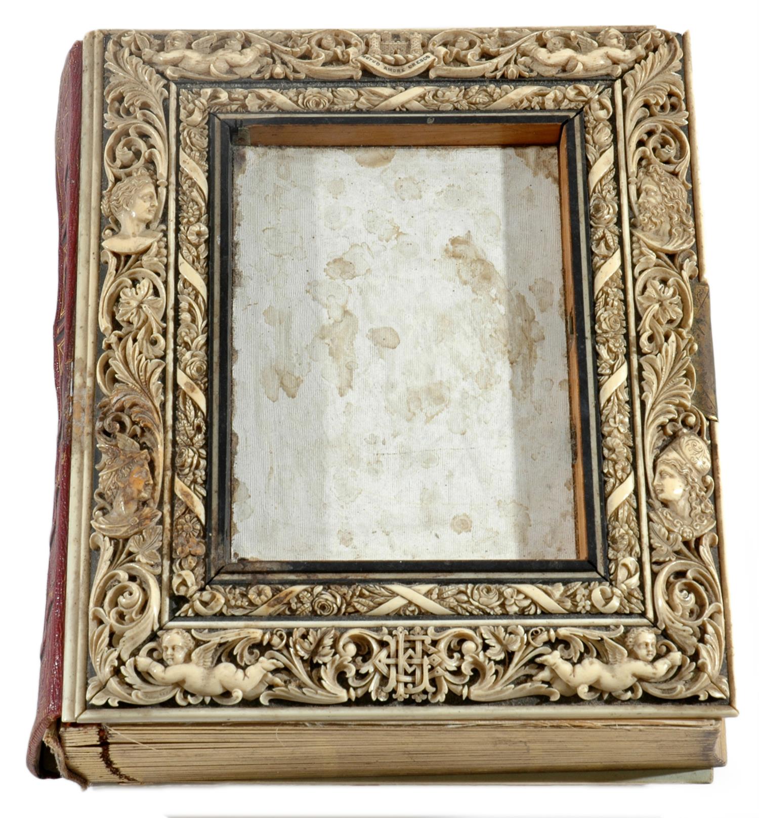 19th century photo album bound by leather with applied ebonised wood and ivory carvings, the ivory carved surround detailed with Gods, Godesses and putti. Family crest at top reading "mutuo amore cresco", Containing 47 hand painted photographs of royals and other notables