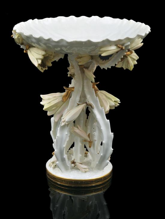 The circular base with a painted and gilded Greek key border supports a base of multiple cactus stems and yellow and gilt flowers all curling up to raise a foliate dish with a fluted rim, pink factory mark to base (hairline crack to dish), 26.5cm high.