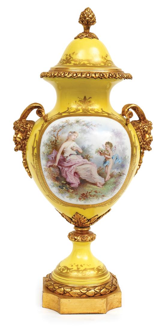 The bulbous body set on a footed base and with high domed cover and pineapple finial, the body displaying scenic cartouches to front and verso on a yellow ground, flanked by bold bacchanalian styled mask head lugs with further gilded ormolu mounts to the base and lid, 52cm high.