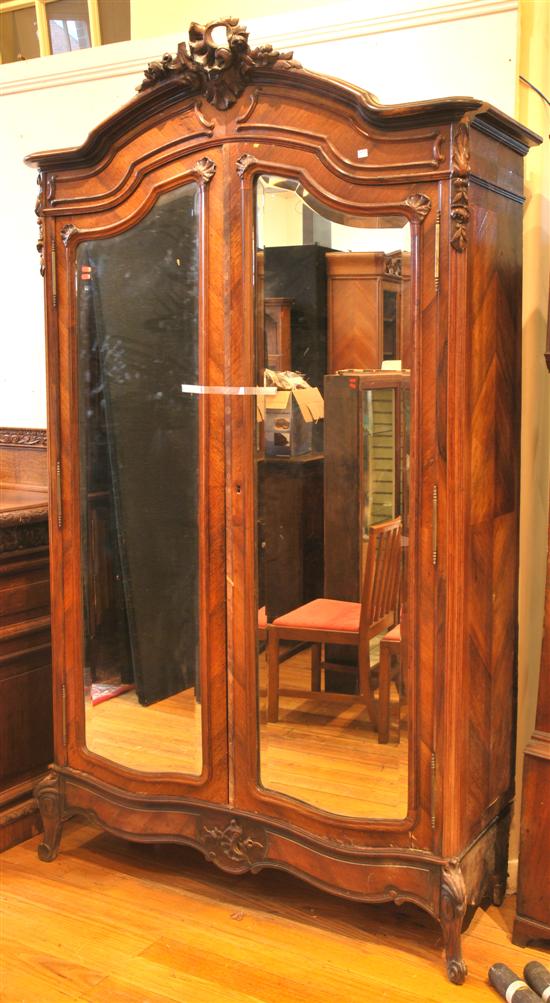 The shaped and foliate carved rectangular pelmet, above two arch panelled mirror doors and a serpentine apron of conforming design, with an internal long drawer, raised on scroll supports, 140.5 x 231 x 55 cm.