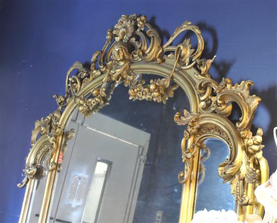 The shaped rectangular three sectional plate within an ornate foliate pierced surround of carved wood and cast plaster, the lower section flanked by two pairs of candle sconces, 240 x 193 cm.