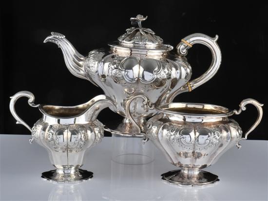 The set each of a tapered lobed form raised on a scalloped foot and with repousse floral decoration, the teapot with makers mark John and Edward Edwards, London, circa 1809, the sugar bowl with makers mark John and Edward Edwards, London, circa 1811, the milk jug with makers mark William Hewitt, London, circa 1837, 1488grs. total weight of silver, the teapot 18cm high.