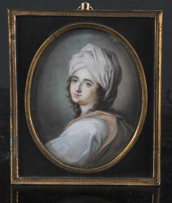 The image set behind an oval glass plate depicts a youth swathed in turban and robes fashioned in an Orientalist manner, watercolour on card, the frame rectangular with gilt edges, 13.5 x 10.5cm (oval)