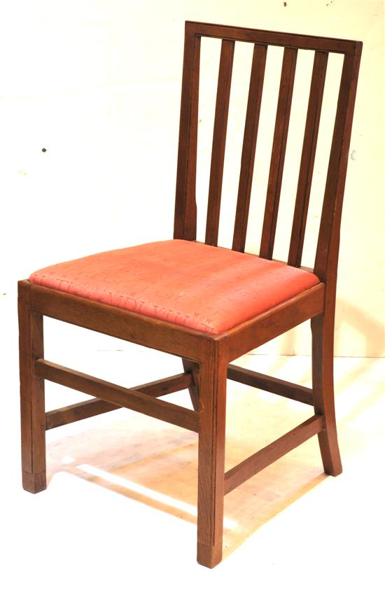 Each with a rectangular crest rail above a slatted back and a cloth upholstered drop in seat, raised on square supports united by cross stretchers, stamped to underside.