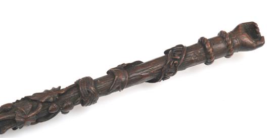 The tapered stem with brass tip to end carved in low relief depicting chestnut branches with bands of plaited rope and an encircling banner entitled 'HMS Nelson', all terminating to the top with a clenched fist, 83.5cm long.