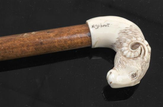 The timber stem with ivorine tip to end and with a carved and incised ivorine rams head handle, incised R.Gibert to collar, 94cm long.