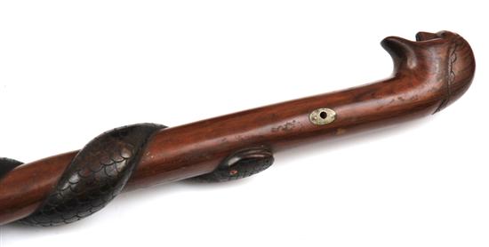 The tapered stem, brass tipped and carved in low relief with an encircling snake surmounted by a stylised head with incised delineation, (some loss to tip) 84.5cm long.