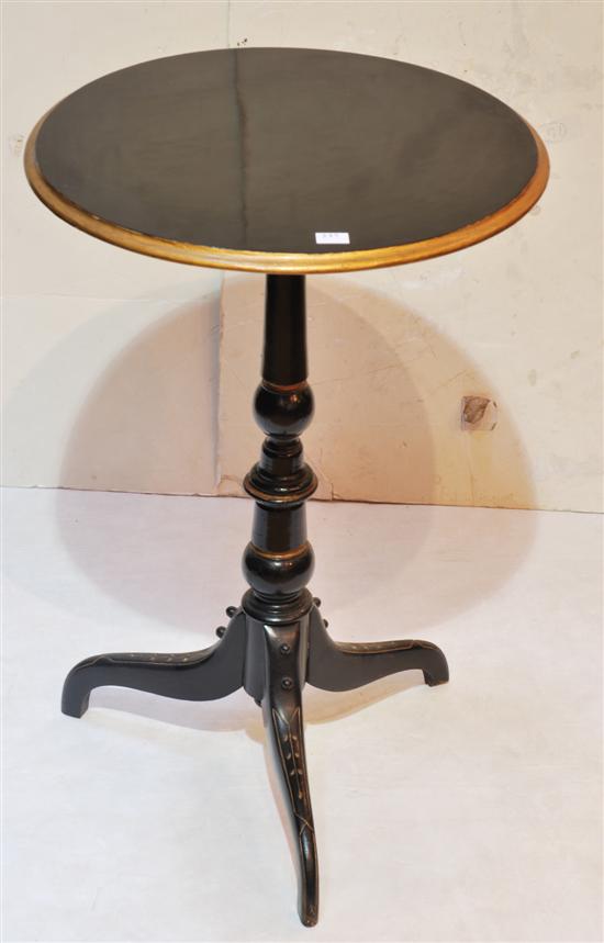 The circular table top raised on a turned stem and a tripod base, 46 cm diameter x 78.5 cm high.