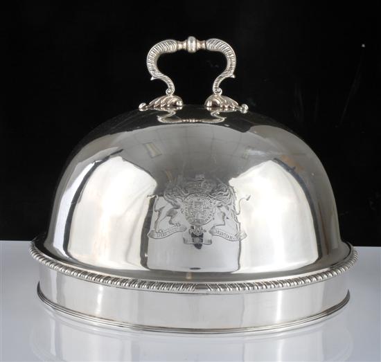 The high domed cover with ribbed trim above the base band and with a small scrolled handle to top displays an incised British coat of arms insignia to front and an alternative insignia to verso, worn hallmarks to handle, 1538 grs. total weight of silver, 28cm diameter.
