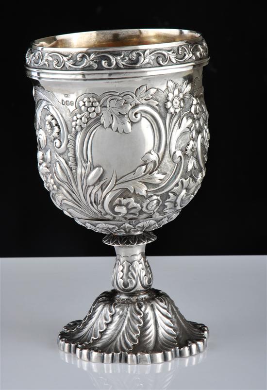 The body of ogee form richly decorated in a repousse panel of floral and foliate motifs flourishing around the body, the tiered base formed with repeat acanthus leafs in low relief, hallmarked internally Charles Rawlings and with further hallmarks to rim and base, 580grs. total weight of silver, 19.5cm high.