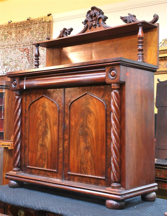 Rectangular, with a carved foliate scrolled back supporting a narrow shelf raised on turned columns and below a single full width drawer above twin doors flanked to each side by barley twist columns, raised on a stepped base on bun feet, 104 x 145 x 46 cm.