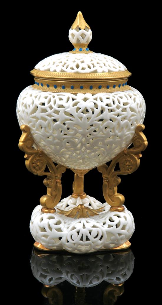 The almond shaped base with a low domed cover, each fashioned from a pierced framework and raised within a gilded tripod surround supported by a further pierced and lobed tier, brown factory mark to base and internally to cover, (finial restored), 18cm high.