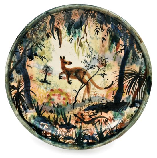 The flattened earthenware dish displays a vivid Australian landscape scene of native flora and fauna, incised AMB to verso, 22cm diameter.