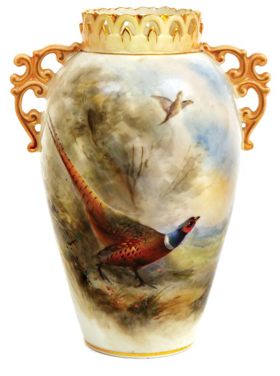 Ovoid, with a pierced and gilded collar painted with a large pheasant amongst wild grasses and flanked to each side a pair of pierced terminals, green factory mark and numbered to base, 13cm high.