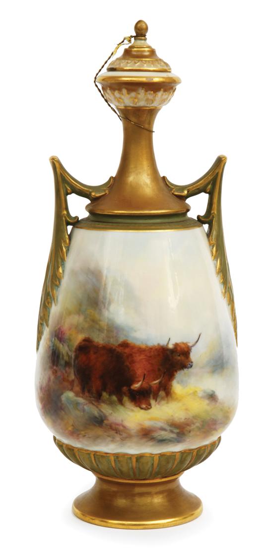 The ovoid body on a moulded footed base painted with a highland cattle scene and flanked to each side with angular foliate terminals from which a sharply tapering neck supports a fine domed cover with gilt linear highlights, puce factory mark and numbered to base, (restoration to cover), 22cm high.