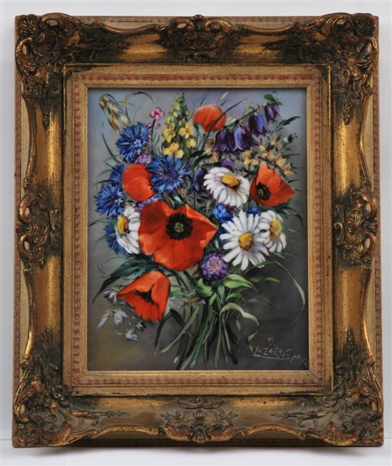 The rectangular plaque painted with a posy of red poppies and other wild flowers on a mottled ground all framed within a gilt moulded surround, sgraffito signature to lower right, factory stamps to verso, the plaque 23 x 18 cm.