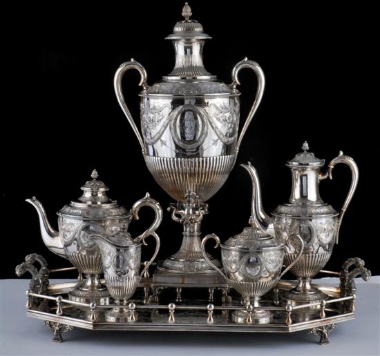 The comprising a tea urn, teapot, coffee pot, sugar bowl and milk jug each of ovoid footed form, lidded with pineapple finial and displaying elaborate engravings of laurel swags encircling a monogram "ECA" cartouches above a gadrooned lower section and included with a large twin handled rectangular tray with chamfered corners, notched gallery and engraved with corresponding motifs and with monogram "ECA", stamped to base, the tea urn 58.5cm high.