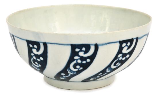 The deep sided bowl on pedestal foot decorated to the exterior in the 'Queen Charlotte' pattern of radiating bands in blue with white floral reserves on a white ground, underglaze blue square mark to base, 15cm diameter.