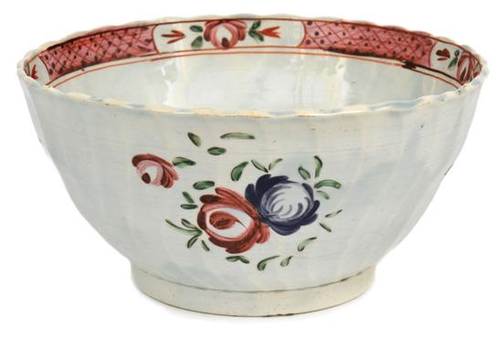 The deep sided bowl with wrythen exterior and scalloped rim decorated with finely painted floral motifs to the interior and exterior of form, 15.5 cm diameter.