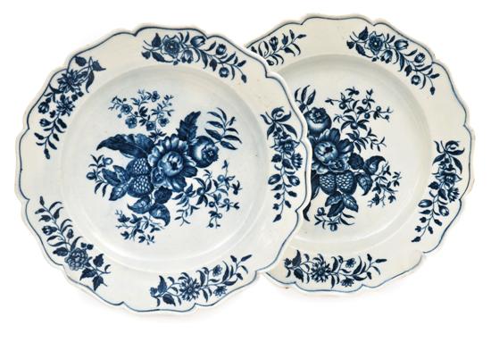 Each of scalloped form painted with a pinecone transfer design in blue and white, with further floral motifs to the rim, blue printed filled in crescent mark to base, 24cm diameter.