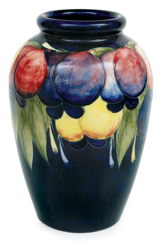 The baluster body painted with wisteria on a dark cobalt ground, impressed Made in England, W.Moorcroft, Potter to H.M the Queen and painted signature and dated 1936 to base, 33cm high.